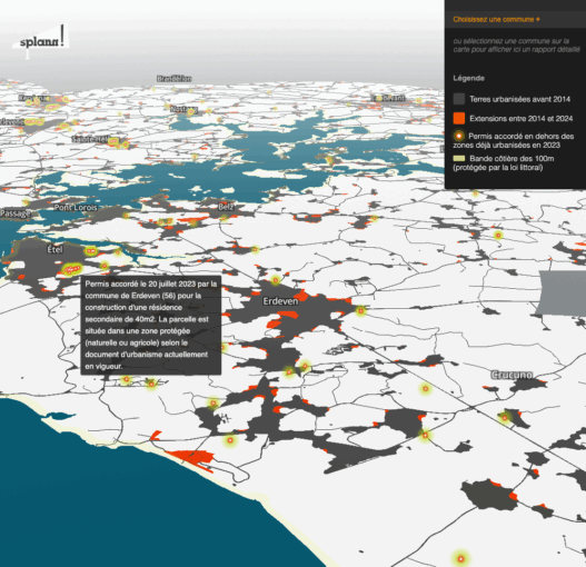 Ces 4 dernières années, plus de 7 000 permis de construire ont été accordés au-delà des secteurs déjà artificialisés sur le littoral breton. Nous les avons tous localisés sur cette carte interactive que vous pouvez explorer librement grâce au travail de Splann !