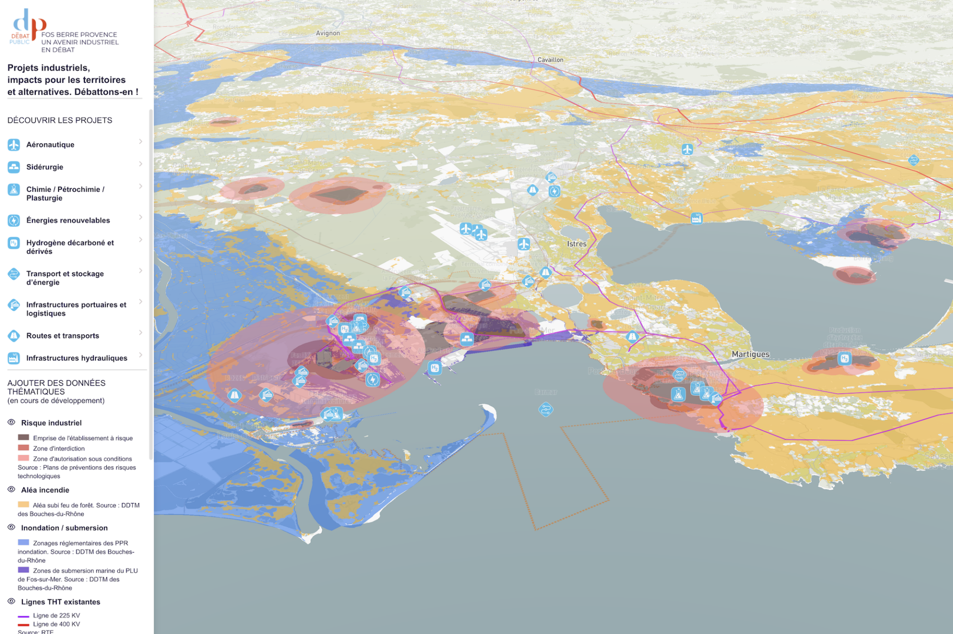 L’outil permet de localiser la trentaine de projets industriels en débat, et d’ajouter des couches thématiques. Une manière d’évaluer les enjeux pour la population, l’environnement, l’emploi, les transports… Son contenu va évoluer au cours des trois prochains mois, en fonction des besoins.